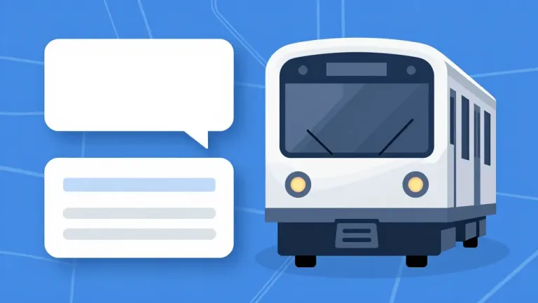 A glossy, smooth modern train is centered with speech bubbles surrounding it, set against a soft, diffused blue grid background. The composition is clean and minimalistic, ideal for communication or transit-themed designs.