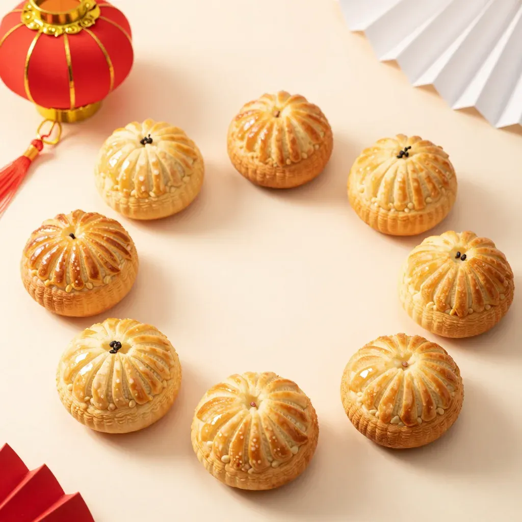 Golden-brown pumpkin-shaped pastries with glossy, flaky crusts arranged in a circular pattern, softly lit to highlight their texture and glossy surface. The soft beige background and blurred festive red lantern create a balanced and shallow depth of field, ideal for culinary and festive themes.
