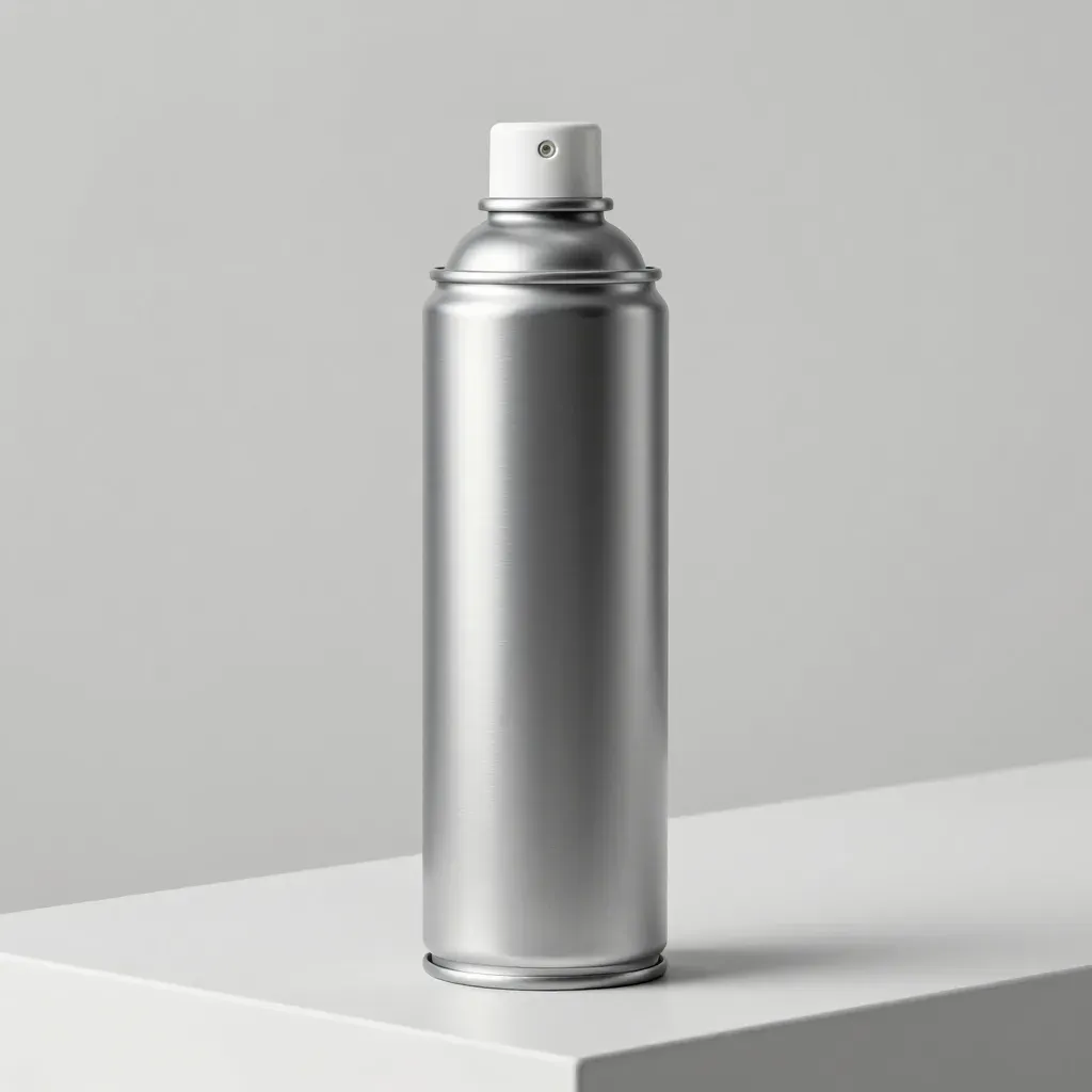 A sleek aluminum spray can with a glossy, reflective surface, softly lit to highlight its contours and reflections. The minimalist white surface and neutral gray backdrop provide ample copy space for design elements.