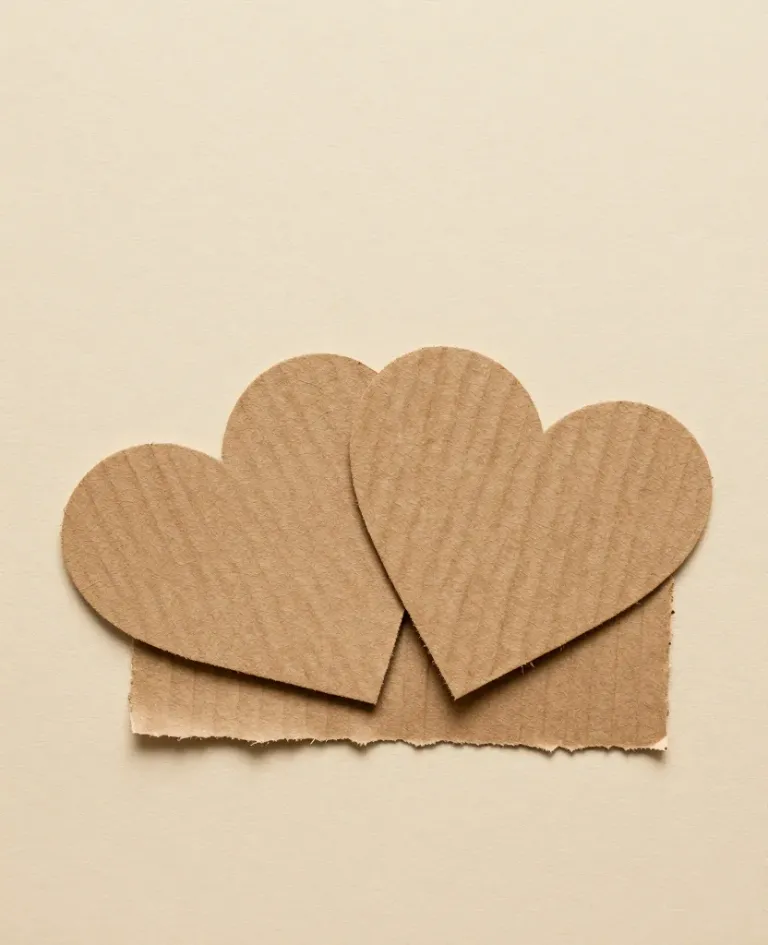 Two heart-shaped cutouts of brown kraft paper, softly lit to highlight their rough, fibrous texture, creating a warm and nostalgic atmosphere. The simple, centered composition with a plain background ensures the focus remains on the tactile, handcrafted feel of the paper.