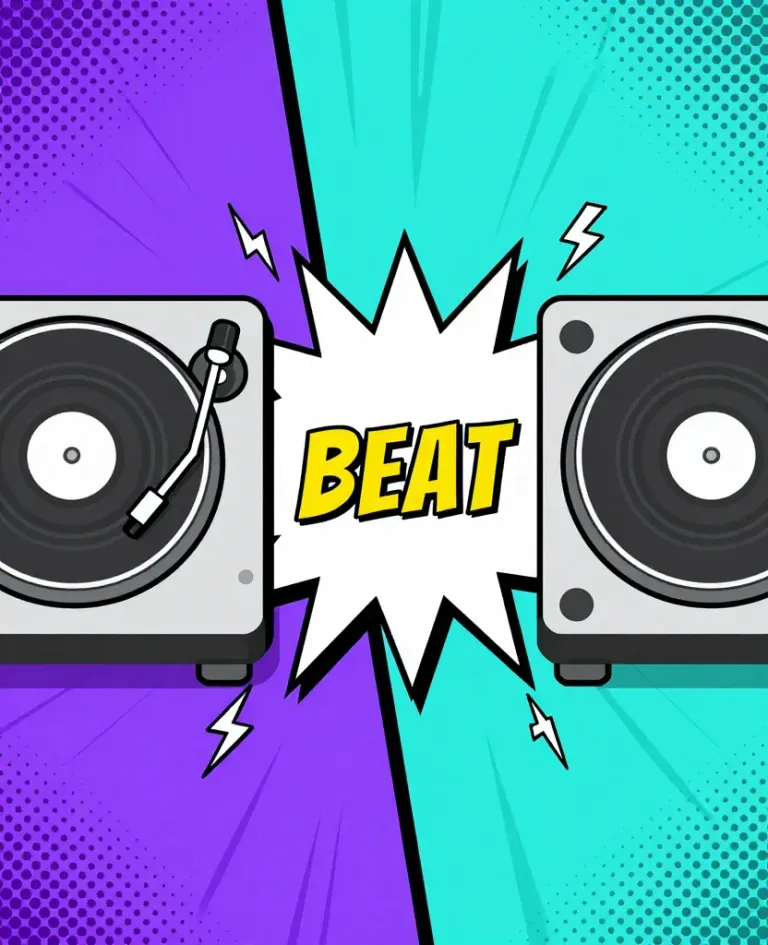 Glossy black turntables with vinyl records are symmetrical on either side of the bold yellow 'BEAT' text, set against a dynamic, bright background with contrasting dotted sections of purple and teal. The composition is clean and framed for graphic design use.