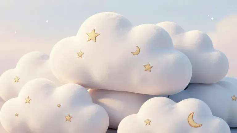 Stacked cloud-like pillows adorned with golden stars and crescent moons, illuminated by diffused, soft light that enhances their three-dimensional texture and creates a dreamy, ethereal atmosphere. The blurred pastel-colored sky with subtle star-like sparkles in the background adds depth and a magical quality to the composition.