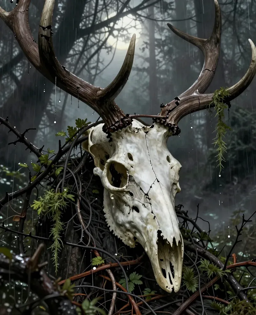 A weathered stag skull with glossy raindrops and gnarled branches, set against a moody, diffused light filtering through a dense, mossy forest. The soft focus and depth of field emphasize the skull, creating a haunting, atmospheric effect.