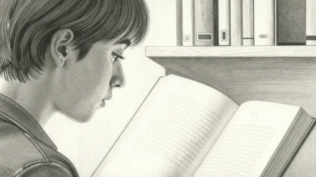 A young person is engrossed in reading a book, with crisp white pages and a soft, textured jacket. The warm glow of a nearby lamp highlights the texture of the book and jacket, creating a serene and focused atmosphere. The background, slightly blurred, features a bookshelf with neatly arranged books, emphasizing the subject's concentration.