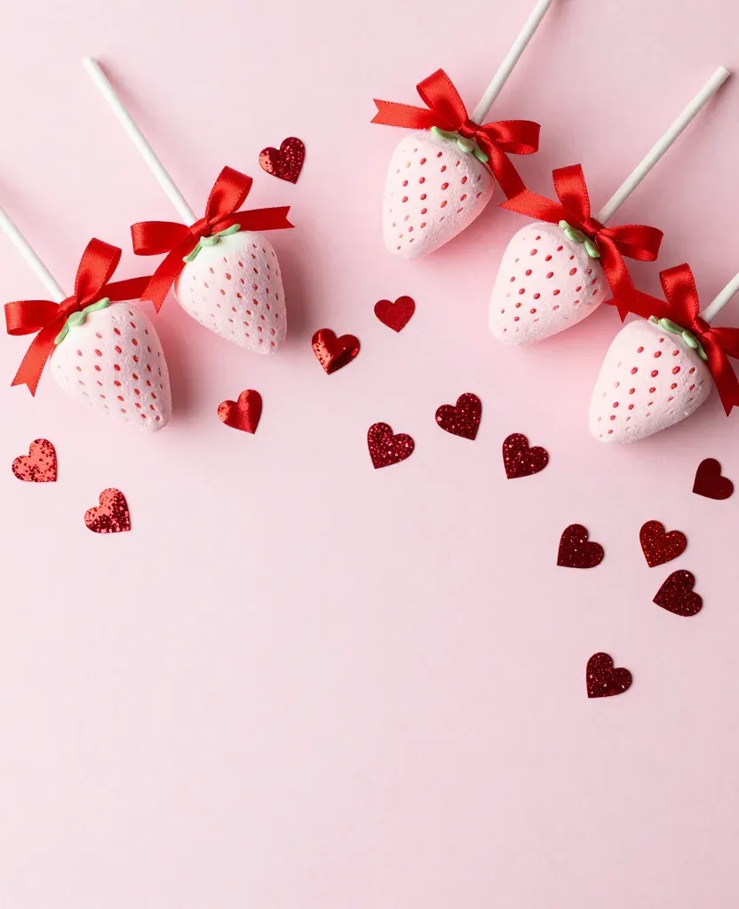 Smooth chocolate-coated marshmallow pops with red ribbons are arranged symmetrically on a soft pink background, creating a glossy and inviting display. The diffused lighting highlights the glossy finish and soft texture, making the pops stand out against the clean backdrop.