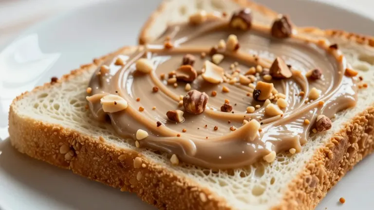Two slices of toasted bread with a smooth, glossy hazelnut spread, topped with crunchy hazelnuts, presented under soft, warm lighting that enhances the natural beige and golden tones, with a shallow depth of field focusing on the bread and spread.