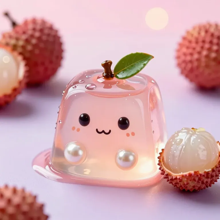 A translucent jelly dome shaped like a lychee, with glossy texture and soft pink hues, illuminated by diffused light creating highlights and reflections. The shallow depth of field blurs the background, focusing attention on the jelly and lychee flesh.