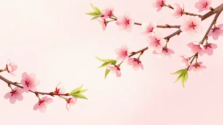 A cherry blossom branch with smooth, glossy pink petals and soft, velvety green leaves sweeps diagonally across a diffused, soft light background, creating gentle shadows and highlights. The blurred, light pink gradient background provides a harmonious and clean backdrop, ideal for product or branding imagery.