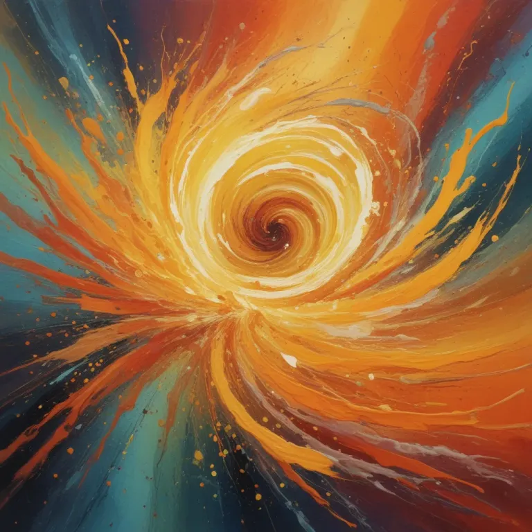 A vibrant spiral of thick, glossy paint with warm oranges and yellows radiating outward, creating a dynamic and energetic visual. The warm glow at the center contrasts with cooler tones surrounding the spiral, drawing the viewer's eye into the depth of the image.