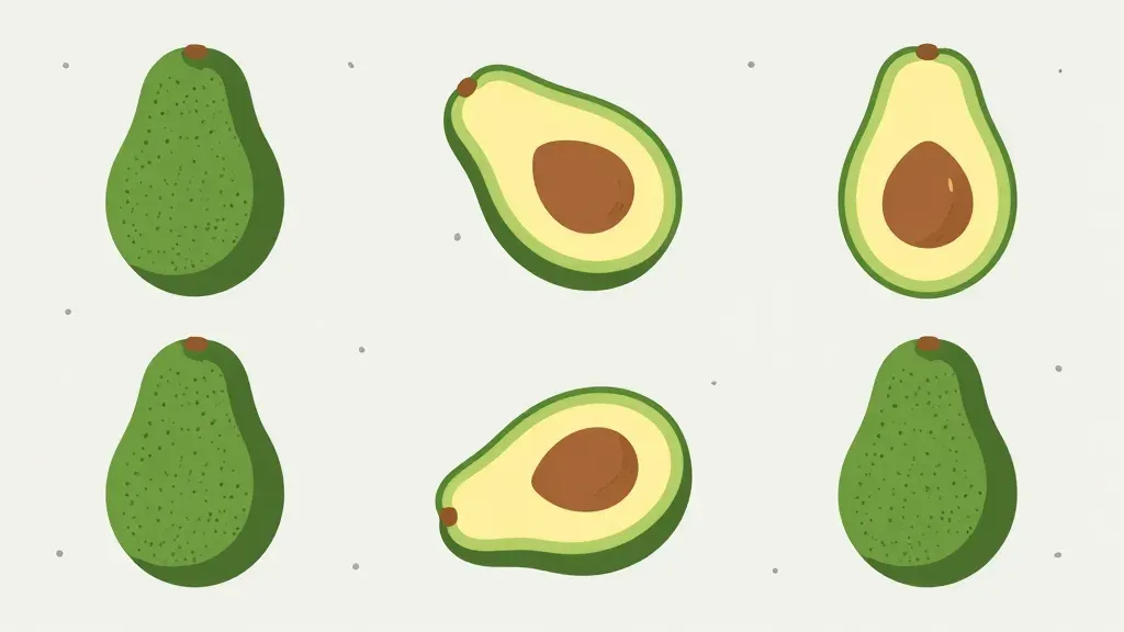 Three whole avocados with rough pebbled skin and three halved ones revealing creamy flesh and smooth pits are arranged in a centered 3x2 grid. Soft overhead lighting creates subtle shadows beneath each fruit on a neutral off-white background with faint speckles, providing clean copy space and uniform focus.