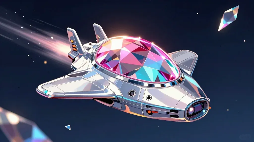 A crystal mini spaceship with polished chrome and glossy reflective surfaces hovers in a star-filled space, illuminated by soft ambient lighting that highlights its curves and facets. The dynamic composition and slightly blurred background emphasize the spaceship's sleek design and create a sense of motion.