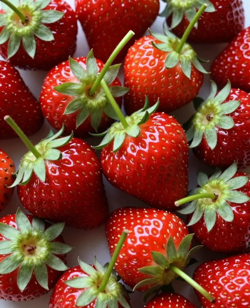 A close-up of fresh strawberries with vibrant red flesh and green stems, softly lit to highlight their glossy surfaces and create subtle shadows, set against a clean white background that emphasizes the berries as the main focus.