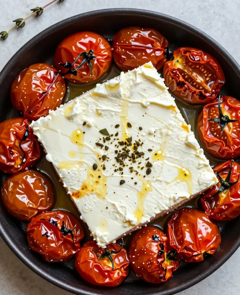 A block of creamy baked feta cheese surrounded by glossy, wrinkled roasted cherry tomatoes in a dark skillet, drizzled with golden olive oil and sprinkled with black pepper. Soft overhead lighting highlights textures with shallow depth of field and a blurred neutral background enhancing focus on the dish.