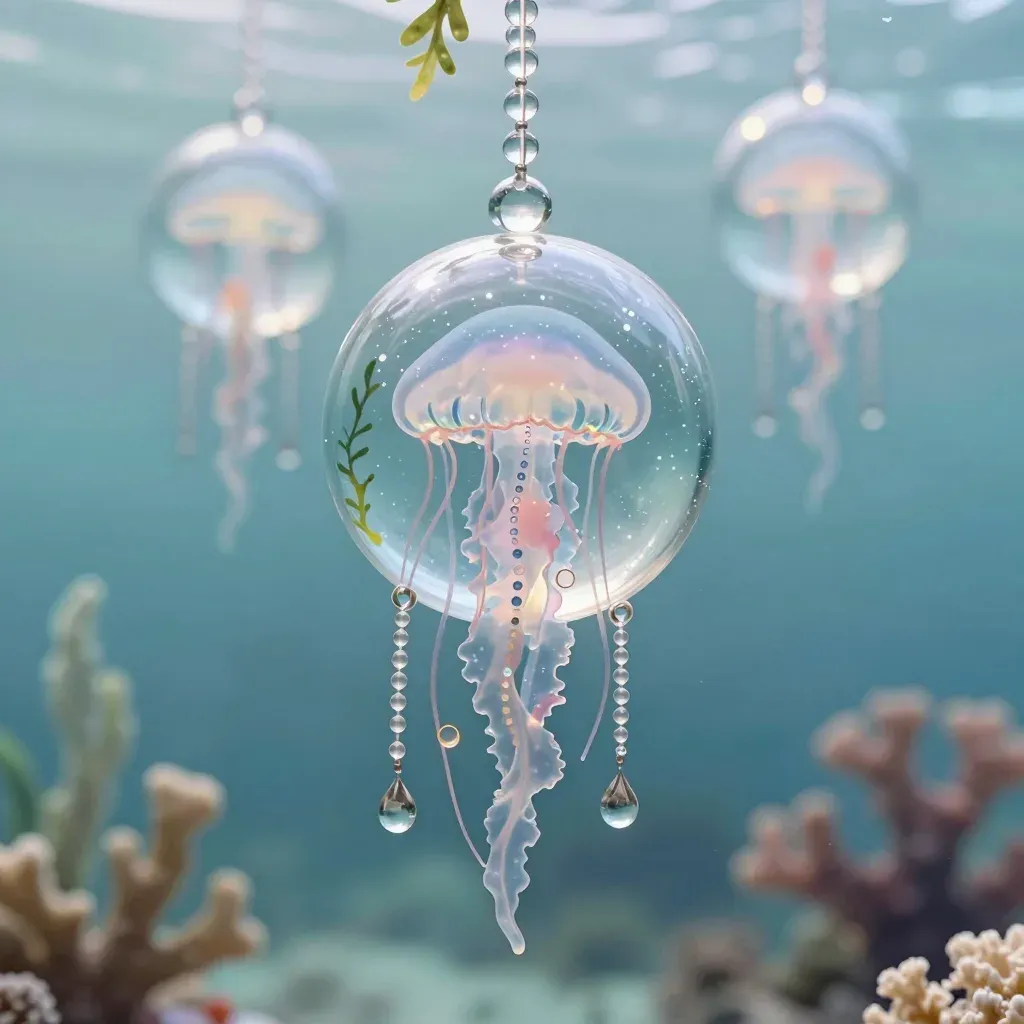 A jellyfish pendant with a translucent, glossy body and delicate tendrils, glowing softly in teal water, creating a serene and ethereal underwater ambiance. The subtle diffused lighting enhances the jellyfish's ethereal glow, making it the focal point against a blurred background of coral and water.