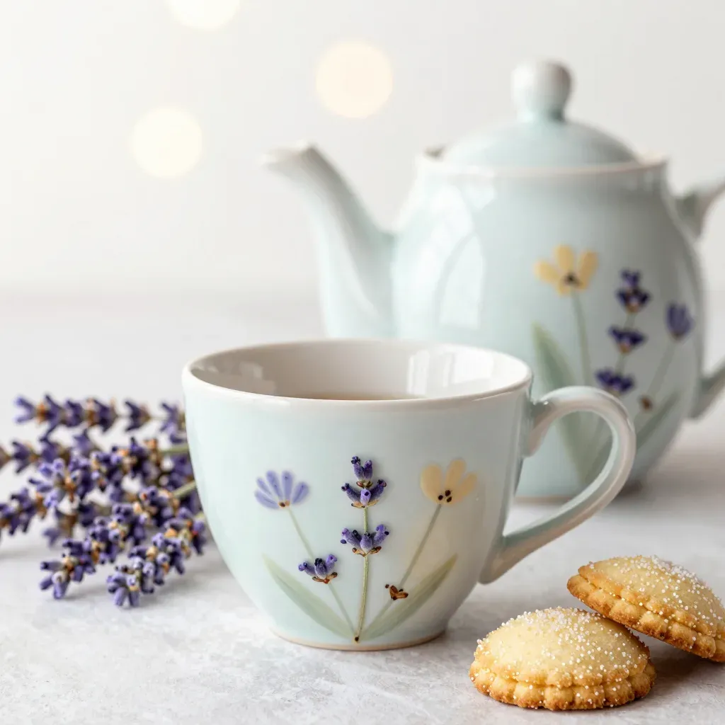 A serene tea setup featuring a porcelain teapot and teacup adorned with delicate lavender and yellow floral patterns, accompanied by sugared cookies, all bathed in soft, diffused light. The shallow depth of field and clean background highlight the intricate details and textures of the porcelain and sugared cookies, creating a tranquil and inviting atmosphere.