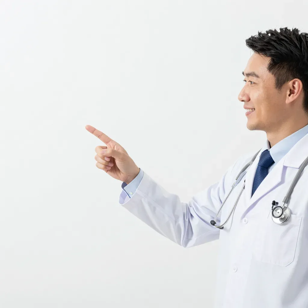 A medical professional in a white lab coat and stethoscope points to the left with a watch-adorned hand, set against a clean, white background. The soft, even lighting highlights the subject and stethoscope, creating a shallow depth of field that emphasizes the subject.