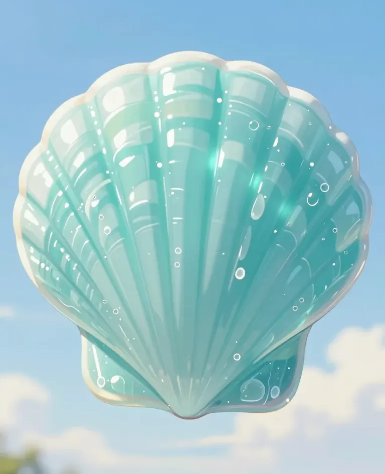 A glossy, translucent blue glass seashell floats gracefully against a soft, diffused light, creating highlights and reflections. The light blue sky with fluffy white clouds in the background emphasizes the shell's delicate beauty and provides a serene, dreamy atmosphere.