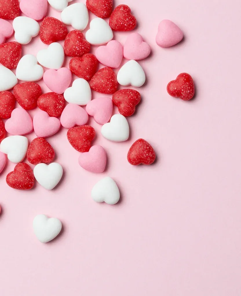 A scattered pile of red, pink, and white heart-shaped sugar candies with a crystalline, granular texture rests on a soft pink surface, illuminated by diffused overhead light that creates subtle highlights and gentle shadows. The shallow depth of field emphasizes mid-ground candies while the clean, matte background provides ample copy space and visual contrast.
