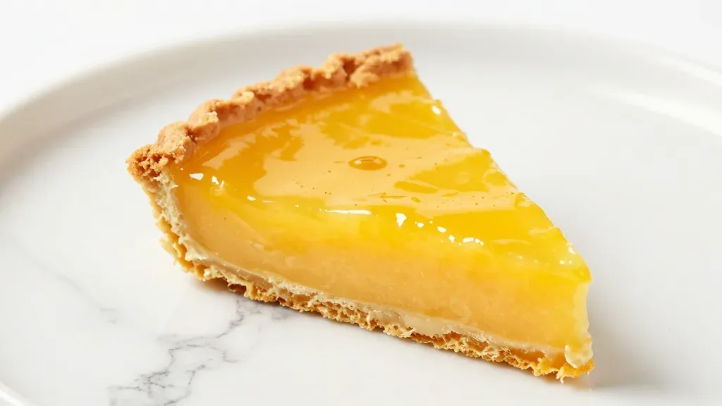 A single slice of lemon tart features a smooth, glossy custard filling and a crumbly golden-brown crust, presented on a white marble-patterned plate. Soft front-right lighting creates gentle highlights on the custard surface, while shallow depth of field isolates the subject against a neutral, out-of-focus background.