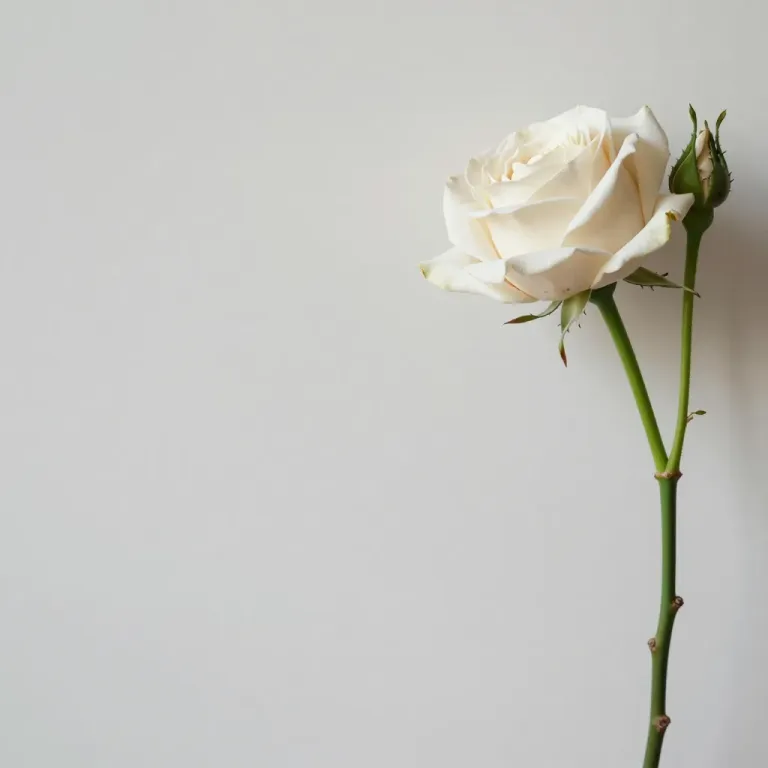 A fully bloomed ivory rose with a bud, showcasing soft, velvety petals and a slender green stem with sharp thorns, illuminated by diffused light that highlights the delicate texture and creates a gentle glow. The minimalist light gray background provides a clean and unobtrusive backdrop, emphasizing the rose's elegance and the potential of the bud.
