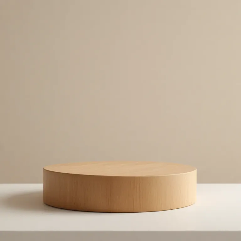 A smooth, natural wood grain table with a glossy finish is centered against a clean, uncluttered beige wall, softly lit from above, creating gentle shadows and emphasizing the table's texture and depth.