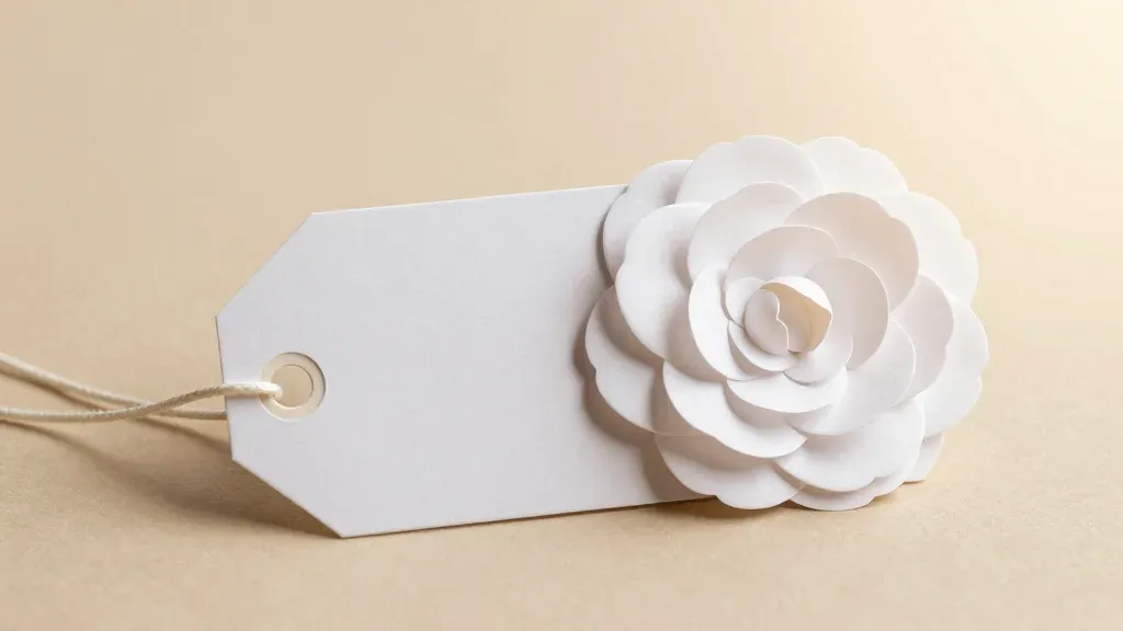 A delicate white camellia bloom crafted from smooth paper with a glossy finish, attached to a gift tag, set against a soft, diffused light that creates gentle shadows and highlights, with a neutral beige background that provides a clean and unobtrusive backdrop.