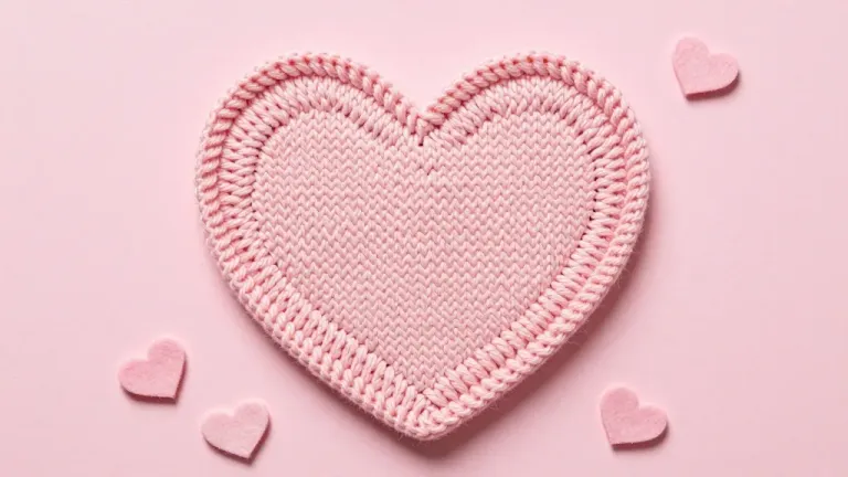 A soft pink knitted heart-shaped coaster is the focal point, surrounded by smaller hearts, all set against a clean pink background. The gentle diffused lighting highlights the texture and creates a warm, inviting atmosphere.