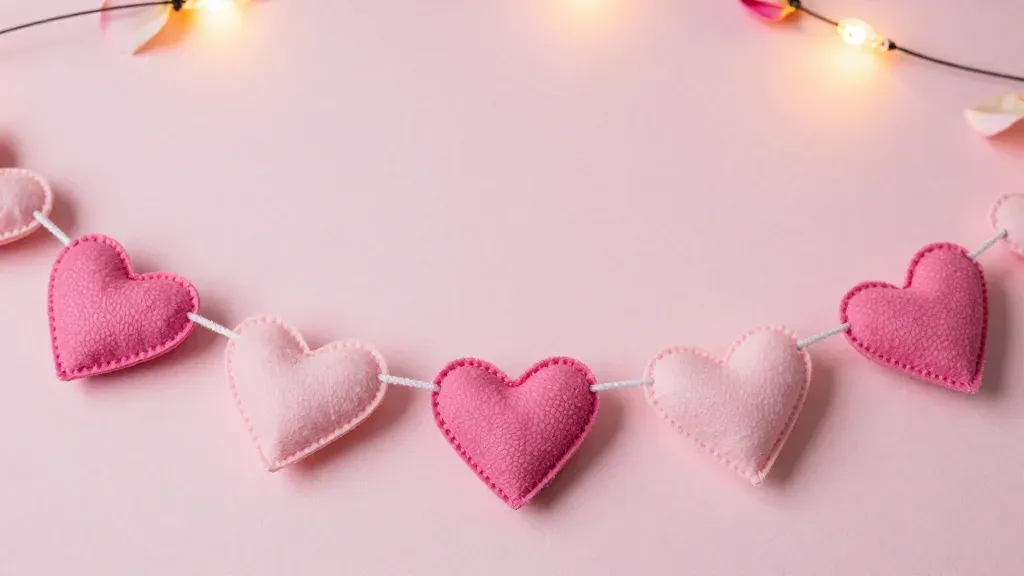 A row of soft pink and blush felt hearts strung together in a garland, with visible stitching and a plush texture, illuminated by warm, diffused light from fairy lights above. The shallow depth of field keeps the foreground hearts in sharp focus while the background blurs into a smooth pastel pink with golden bokeh, providing clean copy space.
