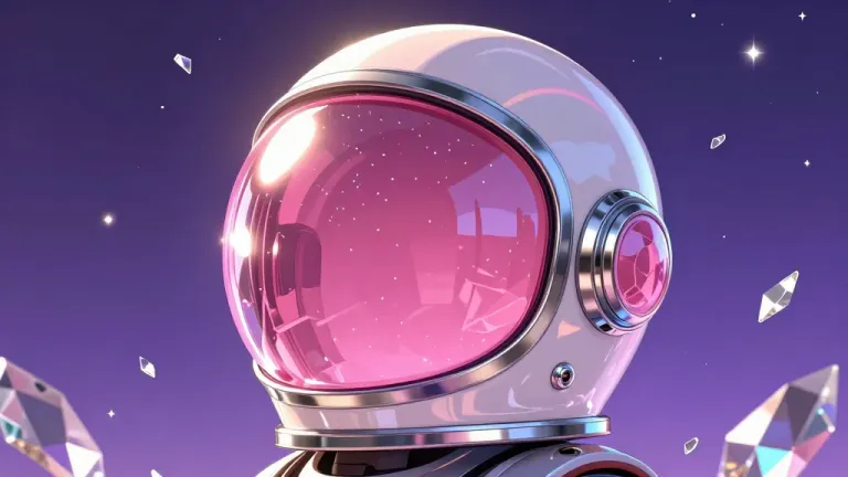 A close-up of an iridescent astronaut helmet reflecting starlight, with a soft, diffused glow and scattered diamonds in the background. The shallow depth of field draws attention to the helmet's glossy, reflective surface and metallic band.