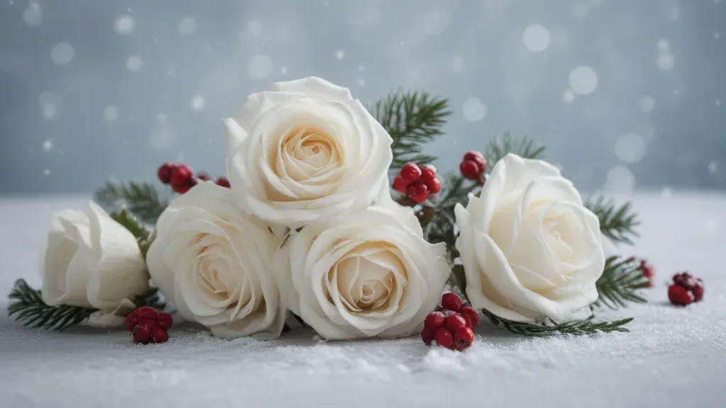 A bouquet of white roses, red berries, and evergreen sprigs is arranged on a snowy landscape, with soft, diffused light highlighting the glossy berries and powdery snow. The shallow depth of field creates a blurred background, emphasizing the delicate textures and colors of the bouquet.