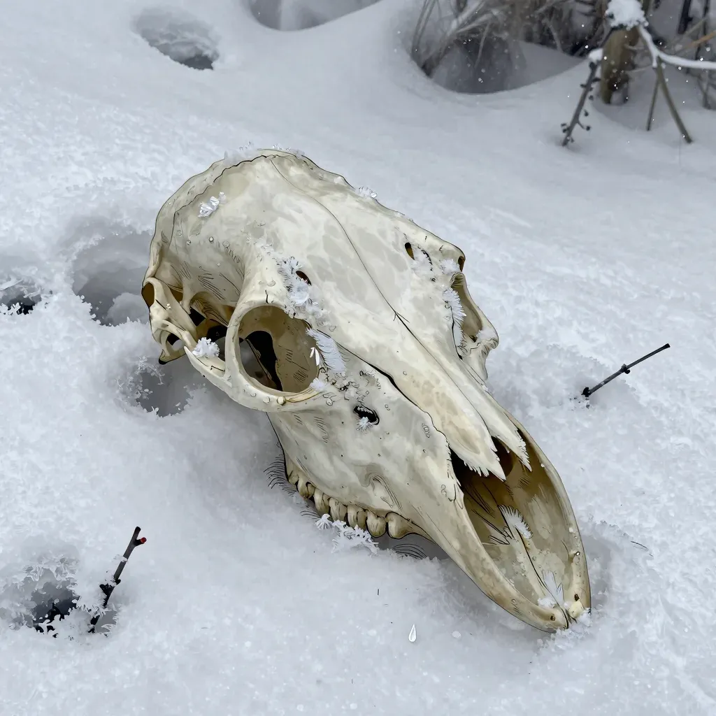 A wolf skull, partially encased in frost, lies in a snowy landscape, illuminated by direct, high-contrast light that casts sharp shadows. The composition emphasizes the skull's intricate details and the serene, wintry setting.