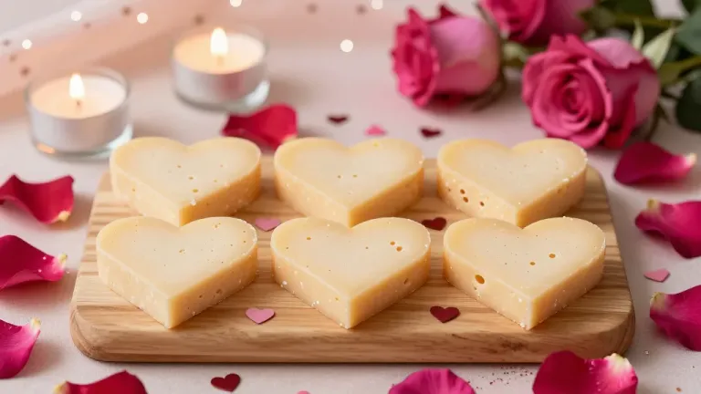 Six creamy heart-shaped cheese slices rest on a natural wooden board, surrounded by scattered pink rose petals and small paper hearts, with soft candlelight enhancing their glossy texture. The shallow depth of field keeps the foreground sharp while blurring the romantic background, creating a dreamy bokeh effect with warm highlights and gentle shadows.