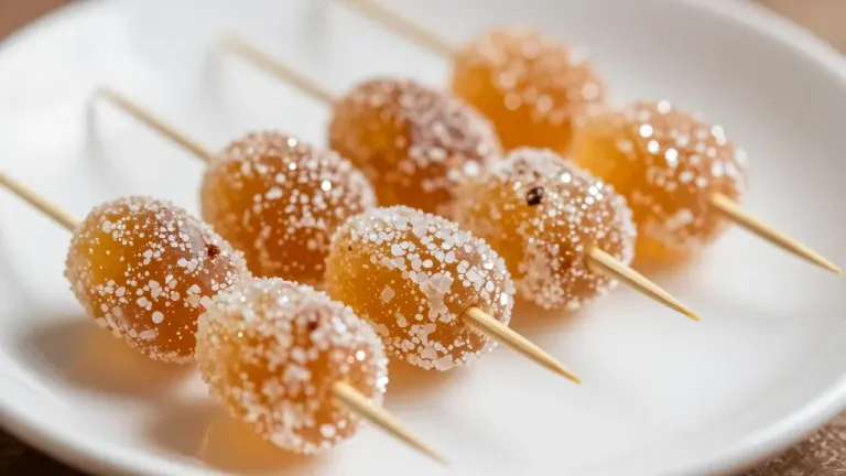 Glossy amber candied ginger pieces coated in coarse sugar crystals are threaded on wooden skewers, arranged diagonally on a white plate. Soft directional lighting from the upper left highlights the sugar texture and creates a shallow depth of field with a blurred warm-toned background.