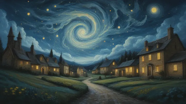 A quaint village with stone houses and thatched roofs bathed in warm, ambient light from the windows, set against a swirling night sky with stars and a full moon. The curving cobblestone path leads the viewer into the village, creating a balanced and inviting composition.