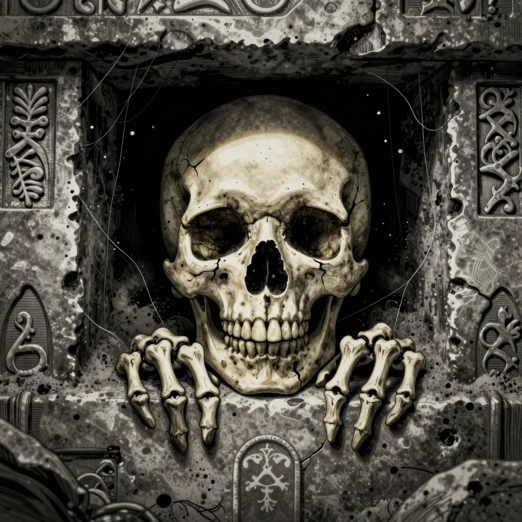 A glossy, cracked skull peeks through a rough, etched stone crypt door, illuminated by flickering torchlight. The dramatic shadows and highlights emphasize the texture and depth of the scene, with a slightly blurred background to draw focus to the skull.