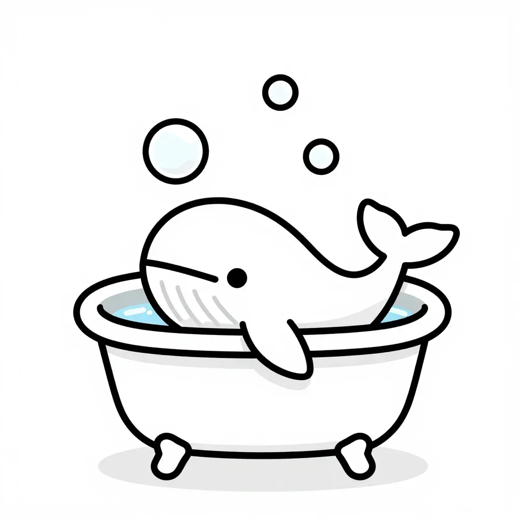 A stylized cartoon whale is depicted taking a bath in a white clawfoot tub, with light blue water and floating bubbles, rendered in smooth, rounded lines. The image features diffused overhead lighting and a centered, symmetrical composition with a plain off-white background providing ample copy space.