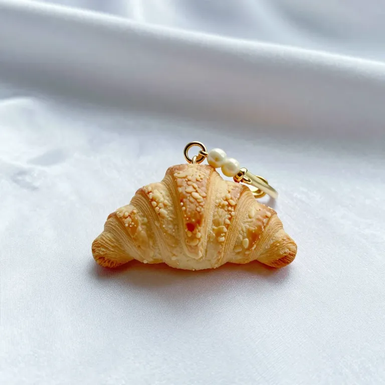 A golden croissant bag charm with sesame seeds and pearls, highlighted by direct overhead lighting, creating a glossy and flaky texture. The shallow depth of field keeps the charm in sharp focus against a soft white fabric background.