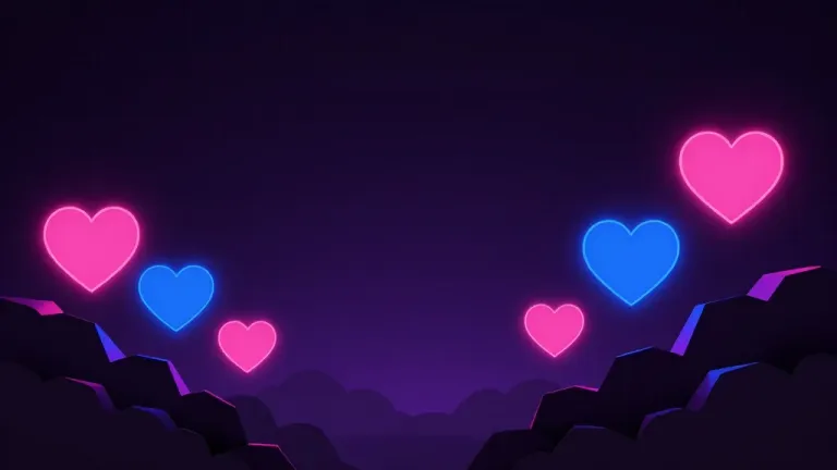 Glossy neon hearts float above rough paper cutout clouds against a dark, clouded sky, creating a vibrant and ethereal atmosphere. The directional lighting highlights the hearts and clouds, adding depth and dimension to the composition.