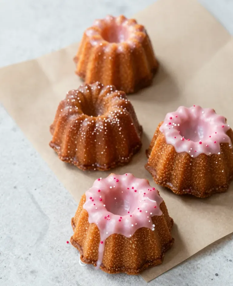 Golden-brown mini bundt cakes with glossy pink icing and white sugar crystals, softly lit to highlight their textures and vibrant colors. The shallow depth of field and neutral background emphasize the cakes, making it ideal for culinary and food photography.