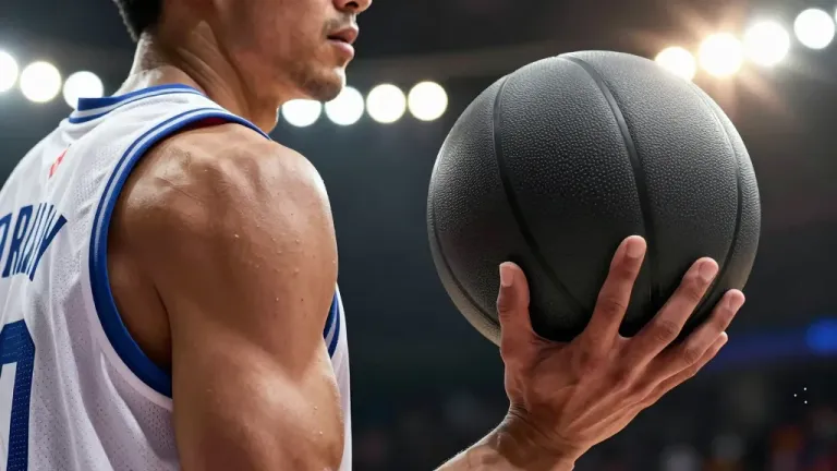 A male basketball player in a white and navy jersey grips a matte black basketball, his muscular arm and hand detailed with sweat beads under bright arena lighting. The shallow depth of field isolates the subject against a blurred background of stadium lights and crowd, emphasizing the dynamic diagonal composition and rim lighting on the silhouette.