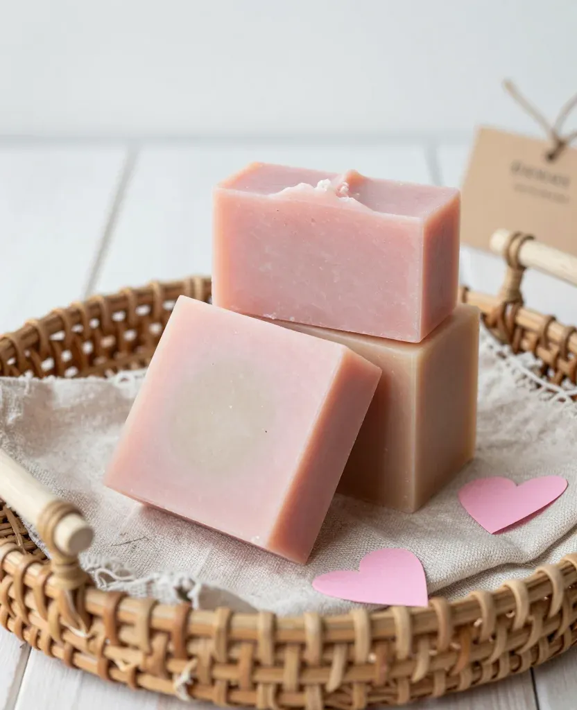 Handcrafted soap bars with a smooth, creamy texture in soft pink and beige hues, softly lit to create gentle shadows, placed in a woven basket with a lace cloth, offering a clean and minimalistic aesthetic.