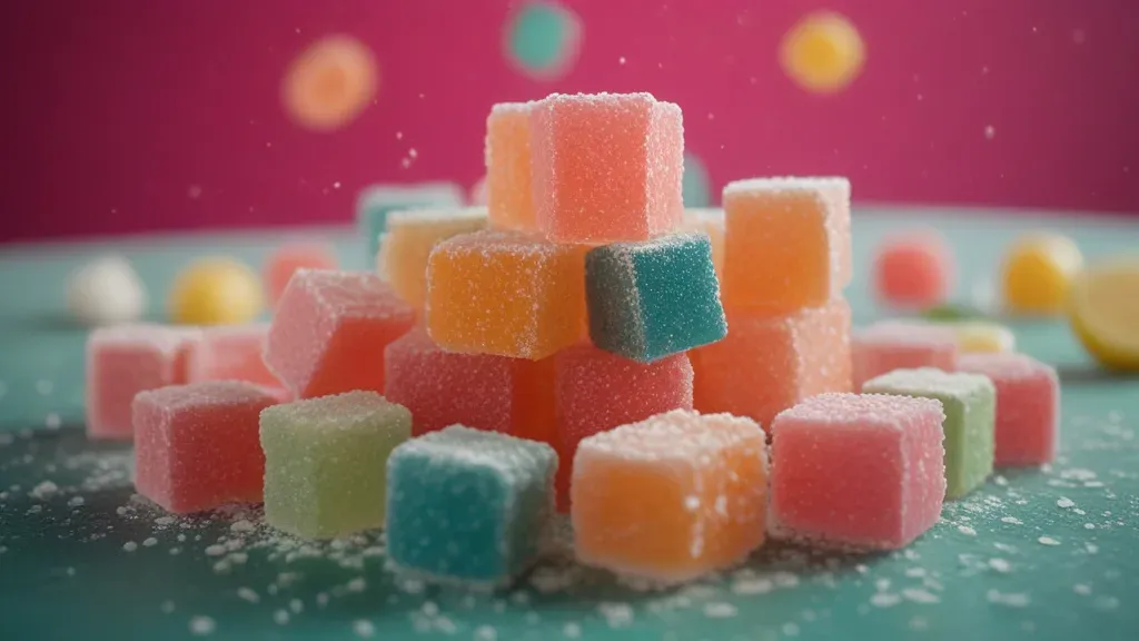 A pyramid of sugared gummy cubes with a translucent, glossy texture, set against a dreamy, ethereal background with soft, out-of-focus lights. The shallow depth of field creates a blurred, atmospheric effect, emphasizing the vibrant colors and sugared coating of the gummies.
