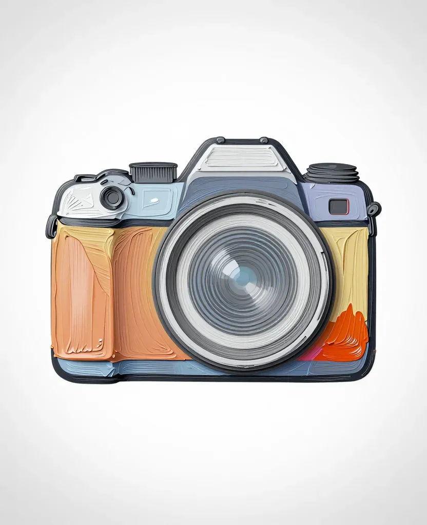 A digital illustration of a camera with glossy orange and yellow sections, set against a soft, diffused light that enhances the texture and depth, creating a balanced and symmetrical composition. The plain white background ensures the camera remains the sole focus.