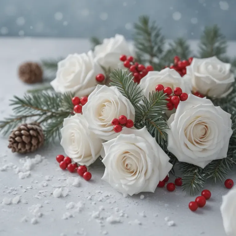 A bouquet of white roses, red berries, and evergreen branches is arranged on a snow-covered surface, illuminated by soft, diffused light that highlights the glossy petals and matte finish of the berries, creating a serene and festive winter scene.