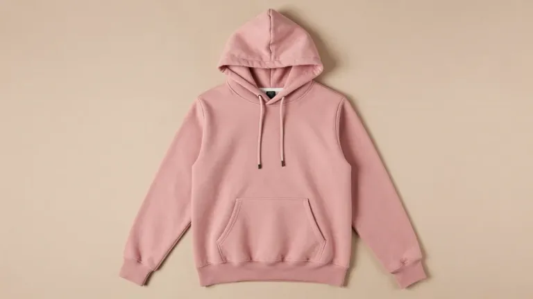 A soft, pastel pink hoodie laid flat with a hood and drawstrings, illuminated by diffused, even light creating soft shadows. The neutral beige background provides a clean and minimalistic setting.
