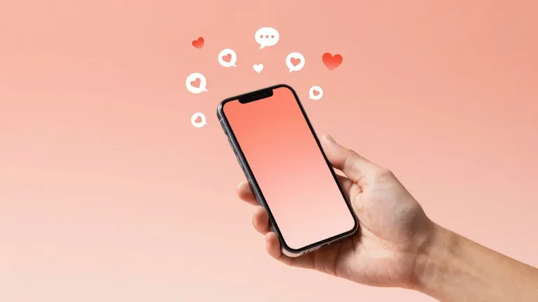 A hand holds a glossy black smartphone with a smooth gradient screen, surrounded by floating white speech bubbles and red hearts against a soft, ambient peach background. The composition emphasizes the hand and phone, creating a visually engaging and emotionally resonant image.