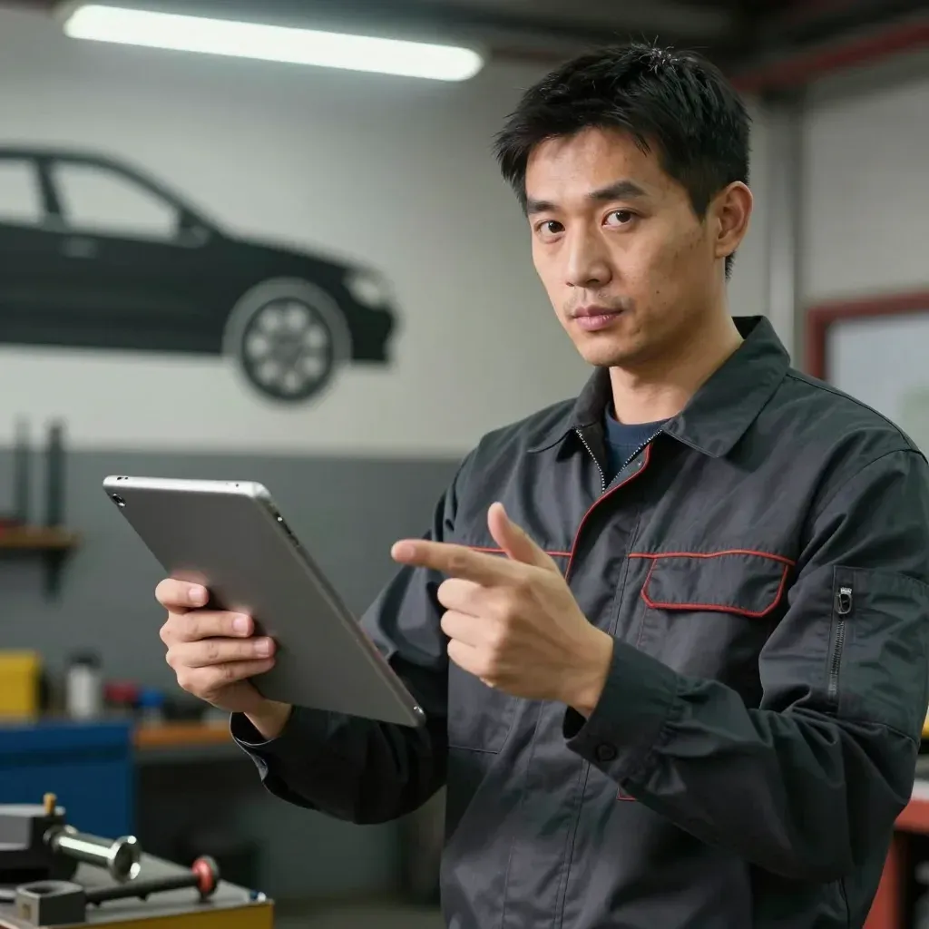 A mid-30s male mechanic in a dark gray work shirt with red stitching holds a tablet and points at its screen, his expression focused under even overhead lighting. The shallow depth of field blurs the background tools and shelves, emphasizing the subject while maintaining contextual detail of the auto repair shop.