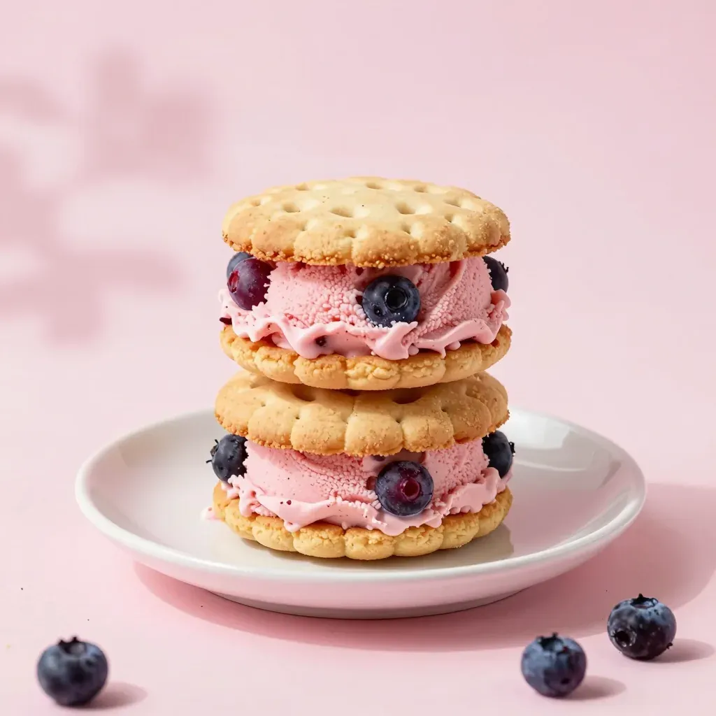 A delectable berry ice cream sandwich with glossy blueberries and crisp biscuit crusts, bathed in soft, warm ambient light that highlights its textures and vibrant colors. The clean and minimalistic setting with a blurred pink backdrop emphasizes the sandwich, making it perfect for food and dessert content.