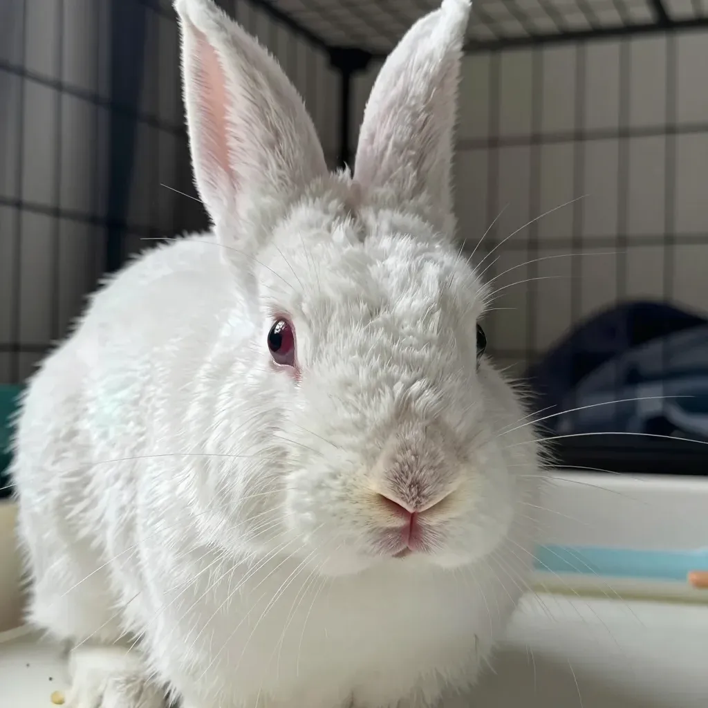 A close-up of a fluffy white rabbit sitting upright, its delicate whiskers and soft fur highlighted by diffused light. The blurred background with a grid-like pattern suggests an indoor enclosure, providing a clean and focused composition.