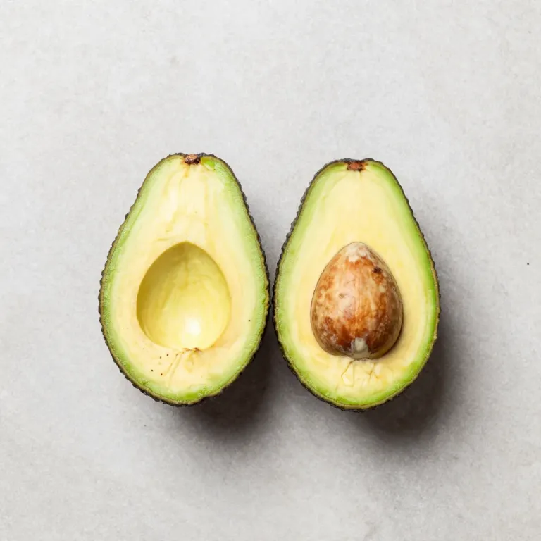 A symmetrical view of avocado halves, showcasing their glossy green outer skin, creamy yellow flesh, and rough brown seed under soft, diffused lighting. The neutral, light gray background enhances the textures and colors, providing ample copy space for design purposes.